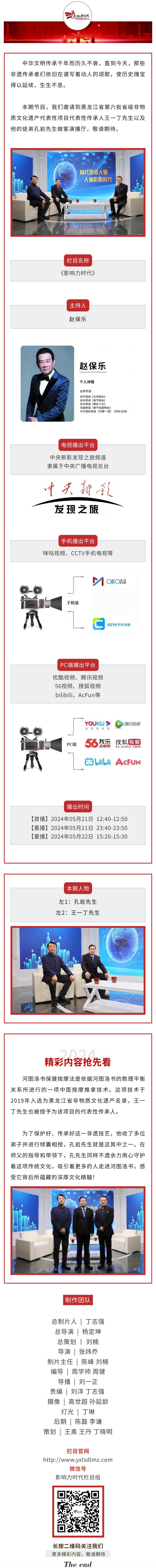节目预告—《时代影响力》栏目组特约受访 24/06/03 16:25:06 中华文明传承千年而历久不衰,直到今天,那些非遗传承者们依旧在谱写着动人的颂歌,使历史瑰宝得以延续,生生不息。 本期节目,我们邀请到黑龙江省第六批省级非物质文化遗产代表性项目代表性传承人王一丁先生以及他的徒弟孔岩先生做客演播厅,敬请期待。 非遗传承,自愈人生——海运仓社区养老驿站公益课堂 探秘非遗绽放精彩